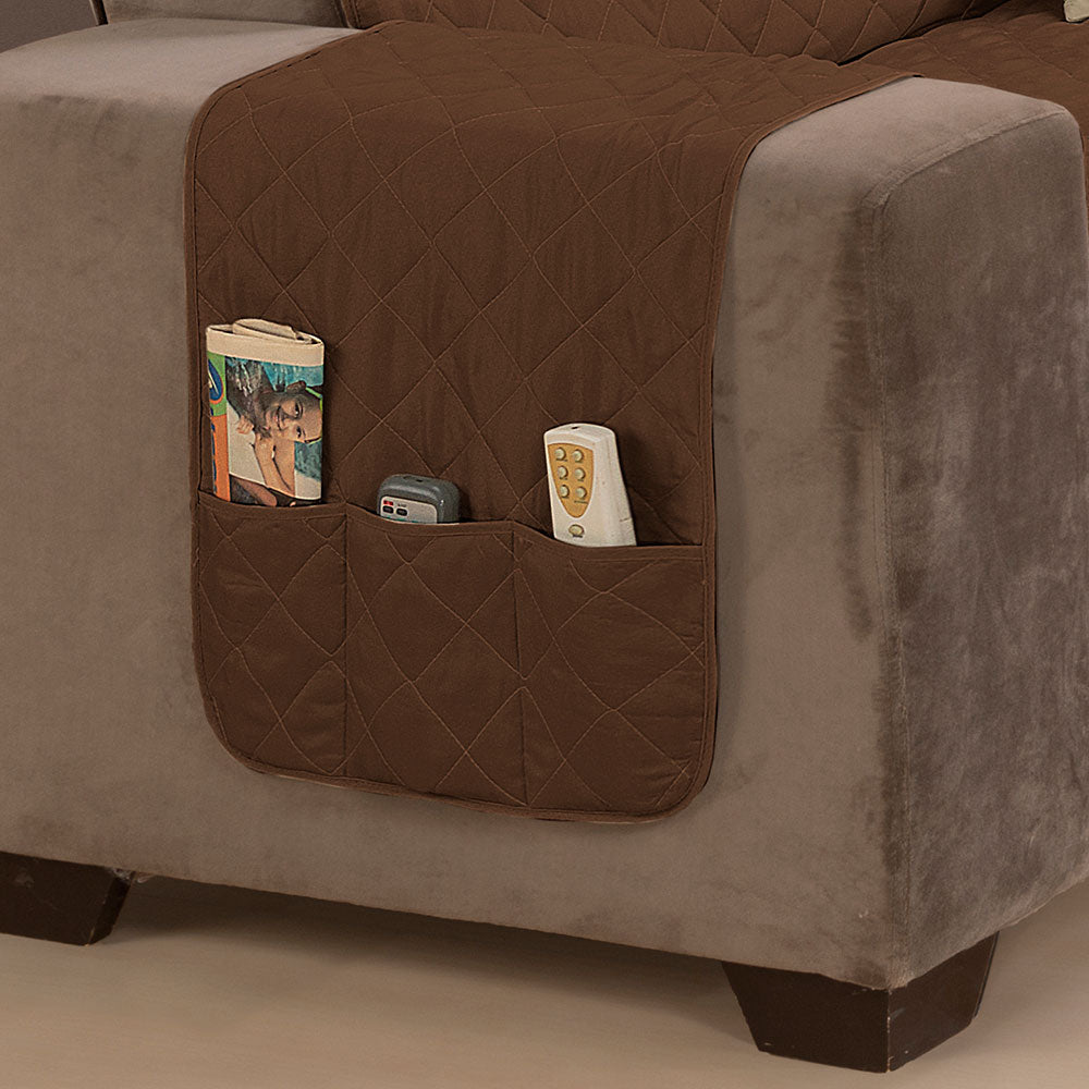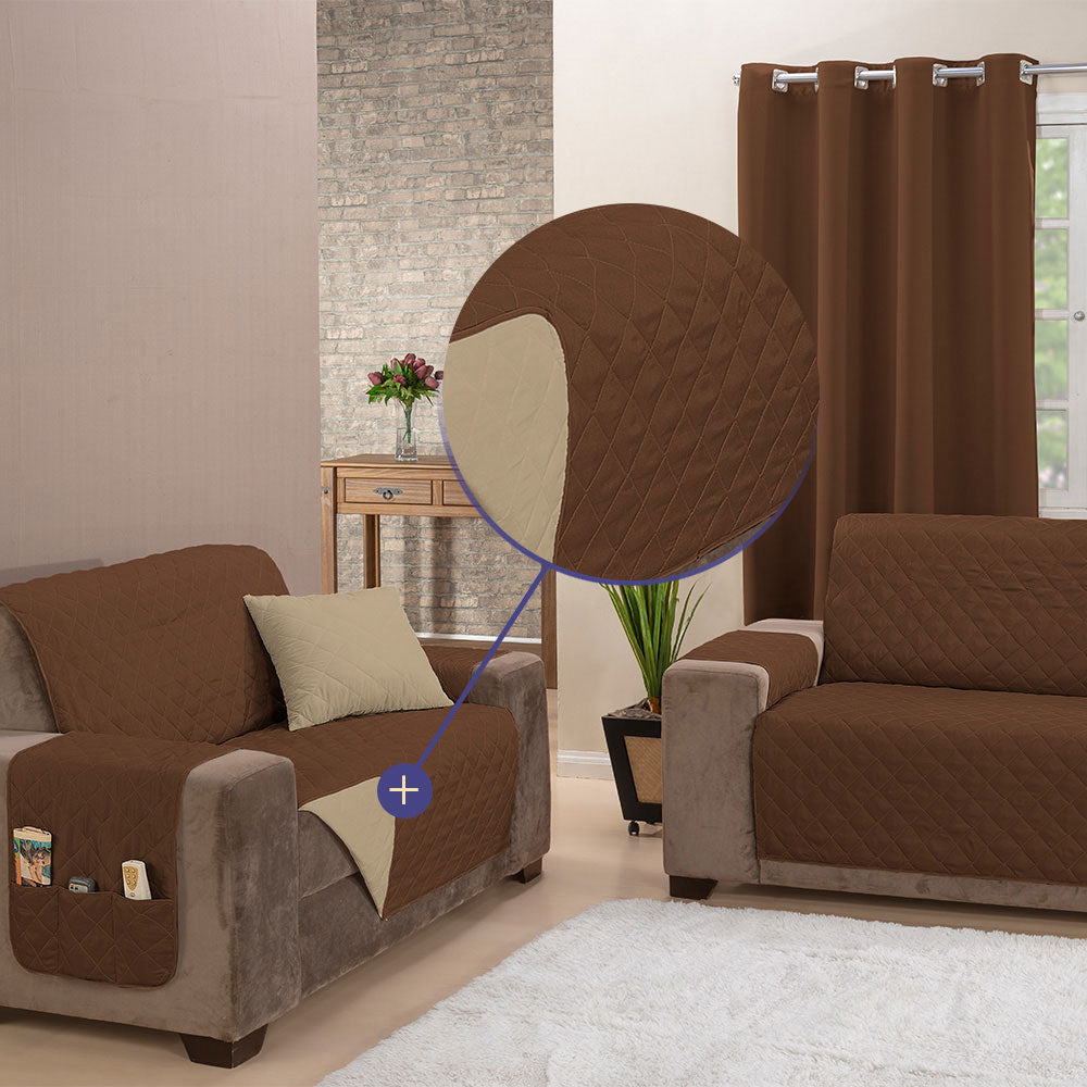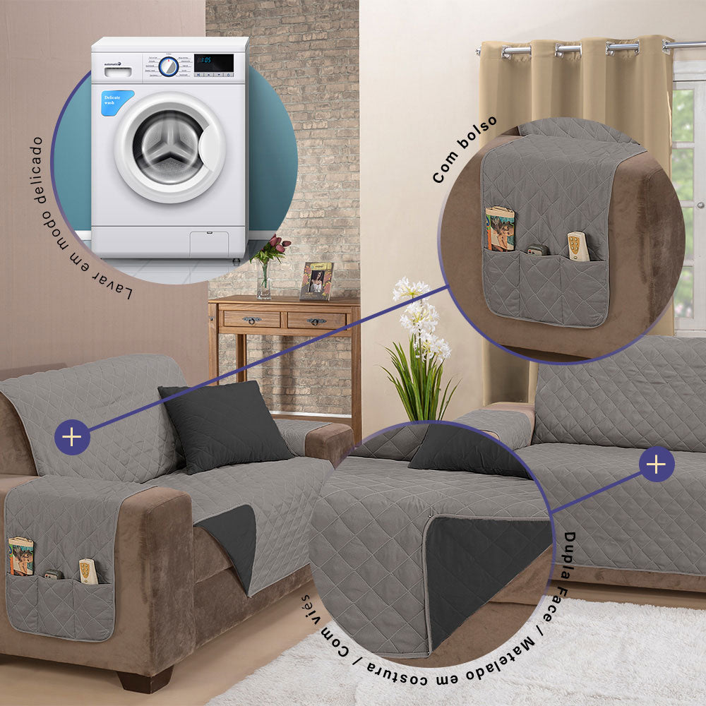 O protetor é habilmente confeccionado com matelado em linhas que formam desenhos de losangos, agregando um toque sofisticado ao seu sofá. Além disso, a praticidade é elevada com a presença de bolsos, também conhecidos como porta-objetos, localizados estrategicamente em um dos braços da capa. Esses bolsos permanecem acessíveis, independentemente do lado da capa que você escolher, proporcionando facilidade ao seu cotidiano.