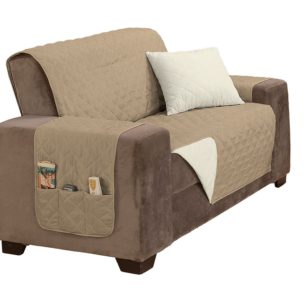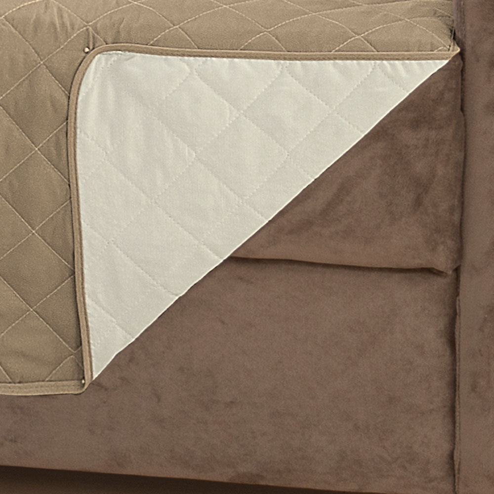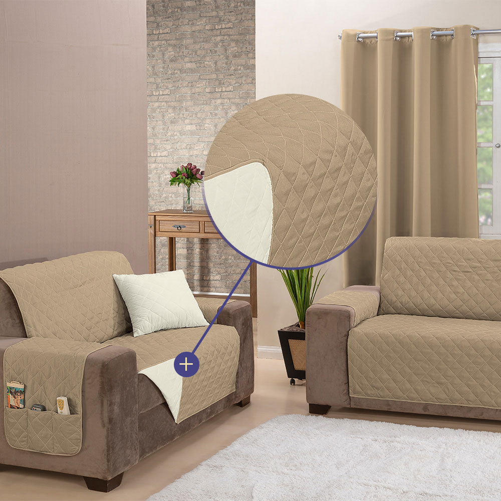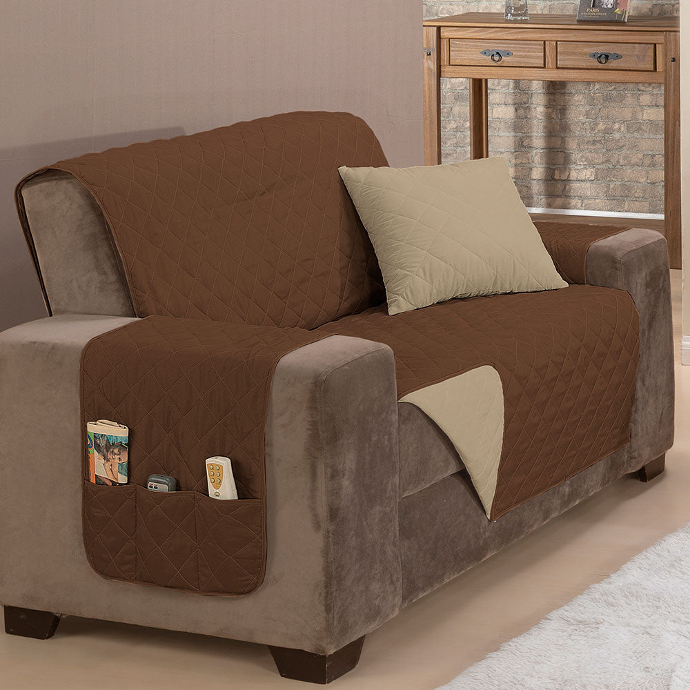 O protetor é habilmente confeccionado com matelado em linhas que formam desenhos de losangos, agregando um toque sofisticado ao seu sofá. Além disso, a praticidade é elevada com a presença de bolsos, também conhecidos como porta-objetos, localizados estrategicamente em um dos braços da capa. Esses bolsos permanecem acessíveis, independentemente do lado da capa que você escolher, proporcionando facilidade ao seu cotidiano.
